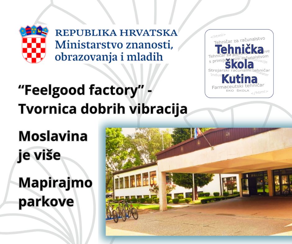 Iz Javnog poziva za preventivne programe Ministarstvo će kutinskoj Tehničkoj školi sufinancirati projekt „Feelgood factory -Tvornica dobrih vibracija“ u iznosu od 1500 eura, iz Javnog poziva za izvannastavne aktivnosti sufinancirat će projekt „Moslavina je više“ u iznosu od 3.870,89 eura te iz Javnog poziva namijenjenog za rad s darovitim učenicima s iznosom od 3400 eura sufinancirat će projekt „Mapirajmo parkove“.