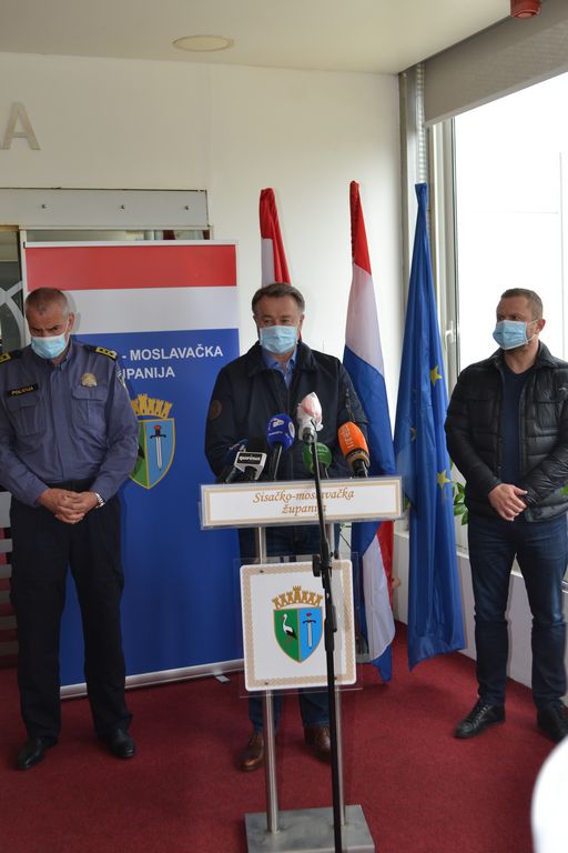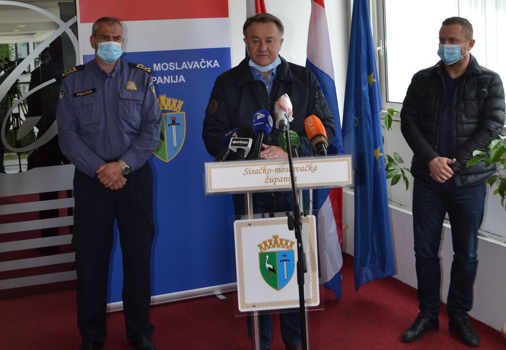 Župan Ivo Žinić i njegov zamjenik, načelnik županijskog Stožera civilne zaštite Roman Rosavec, su u ponedjeljak, 20. travnja 2020. godine, neposredno nakon sjednice Stožera, održali ispred sisačkog hotela „Panonija“ konferenciju za medije.