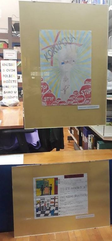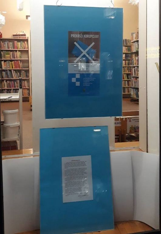 Na Dječjem odjelu sisačke knjižnice od 28. siječnja do 11. veljače izloženi su likovni i literarni radovi učenika osnovnih i srednjih škola s područja Sisačko-moslavačke županije koji su sudjelovali na natječaju Antikorupcijskog povjerenstva Sisačko-moslavačke županije "Prekriži korupciju". Cilj natječaja bio je da o štetnosti korupcije djeca doznaju u najranijoj dobi te se i sami uključe u stvaranje društva s nutom stopom tolerancije na korupciju.