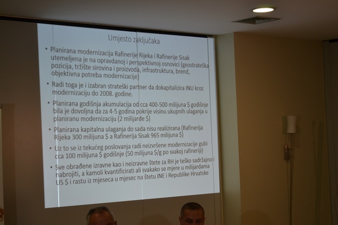 Uvodničari su bili akademik Mirko Zelić, predsjednik Znanstvenog vijeća za naftu i plin HAZU, mr. sc. Ivan Medarac, nekadašnji direktor energetskog sektora INE i Predrag Sekulić, predsjednik Radničkog vijeća i koordinator Stožera za obranu Rafinerije nafte Sisak. Zamjenica župana Anita Sinjeri-Ibrišević, koja je također nazočila ovom skupu u svom je obraćanju rekla: „Pozdravljam Vas ovdje kao zamjenica župana Sisačko-moslavačke županije i neću govoriti kao političarka, nego kao rođena Siščanka, kao dijete koje je odraslo ne zahvaljujući INI, nego zahvaljujući Željezari, koje danas više nema. Ne želim da se desi da i ovaj naš gigant u gradu Sisku na kojeg smo svi bili ponosni, jer Sisak je bio prepoznatljiv po INI rafineriji nafte, ne želim da se ugasi. Kao što svi mi dobro znamo rafinerija je u ratu branila i Sisak i Zagreb i Republiku Hrvatsku. Izgleda, nažalost, da je došlo vrijeme da Hrvatska i Zagreb brane Sisak u miru. Kao i svi ostali ovdje pozivam Vladu RH, ili možda bolje reći da to nije naša hrvatska vlada jer hrvatska vlada bi se trebala boriti za nacionalne interese i nacionalnu sigurnost Republike Hrvatske, ova se za to izgleda ne bori, međutim, bez obzira na to ja je pozivam da raskine štetni ugovor, da podignu tužbu protiv partnera i da spase ove ljude, da spase grad Sisak i da spriječe da grad Sisak postane grad duhova.“