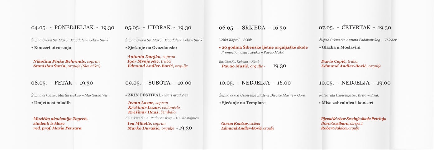 U Sisku nas 6. svibnja očekuje bogati festivalski program koji počinjemo već u 16.30 predstavljanjem 20 godina Šibenske ljetne orguljaške škole u dvorani blaženog Ivana Pavla II u Velikom Kaptolu. Slijedi promocija Porinom ovjenčanog nosača zvuka Pavla Mašića (Anđelko Klobučar: Skladbe za orgulje, Croatia Records, 2014.), a navečer ćemo i poslušati dio programa sa tog nosača zvuka na koncertu pavla Mašića u Bazilici Sv. Kvirina.
